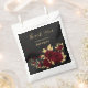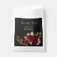Chic and elegant wedding favour bag featuring beautiful burgundy flowers and some elegant gold leaves on black background.