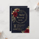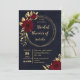 Chic and elegant navy blue bridal shower invitation featuring beautiful burgundy flowers and some elegant gold leaves botanical wreath.