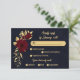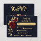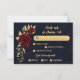 Chic and elegant navy wedding response card RSVP with meal choice option featuring beautiful burgundy flowers and some elegant gold leaves.