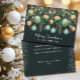 Elegant Christmas holiday flat greeting cards feature a design of pine branches, green and gold Christmas ball ornaments and ribbons on a black background with your details in chic lettering on the front and your personal greeting and names on the back. Order PRINTED and/or INSTANT DOWNLOAD to send digitally. MATCHING items in our collection.