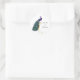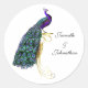 Elegant wedding sticker, with a vintage illustration of a colourful peacock, on a gilded stand. Black script text has the bride and groom's names and is ready to personalise. Lovely finishing touch to your peacock themed wedding invitation envelopes or as gift tags.