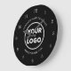 Replace the sample company logo and text with your own in the sidebar to create a chic wall clock for your business with a black background. White or light coloured logos will work best on the dark background. Classic white numbers around the edge make it easy to tell the time. Your text curves around the top and bottom of your logo. Click "Edit using Design Tool" if you need to adjust the size of your logo with the scale buttons or to change the background colour.