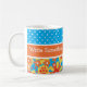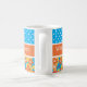 A very stylish white Coffee Mug to personalise if you wish, with a mix'n'match pattern pattern of red, orange, yellow flowers on a bright turquoise background, from a handpainted paper collage by Judy Adamson, teamed up with a coordinating turquoise and white polka dot pattern.