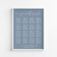 Chic downloadable dusty blue wedding seating chart poster for up to 16 tables featuring your names and wedding date in classic white serif typography, "our favourite people" in a stylish white script and the table numbers and names of your guests in simple white lettering. You can select the digital download option to edit with last minute changes and print locally.