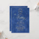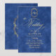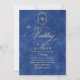 Elegant stylish blue and gold modern wedding invitation with an elegant handwritten font with curls and a monogram of the bride and groom. Classy and elegant, simple and modern invitation.