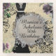 A chic black dress on a gold backdrop with violet flowers and decorative swirls with a silver circle with silver flourish where you can customise your event. Girly glam stylish vibes.
