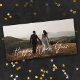 This new years photo card design features the greeting "Happy New Year" in modern white calligraphy script. The back is a black faux metallic pattern but can be edited or removed. This full-bleed layout allows your photo to really stand out.