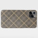 Contemporary faux gold plaid tartan gingham pattern on a dark taupe brown background. Beautiful, modern, and cool cover for the trend-savvy and art-loving hip trendsetter, artsy motif lover who wants to protect their phone from dust and dirt, wear and tear. This design is available for iPhone 6, 7, and 8 Plus, 10 or X, XR, XS, 11, 12, 13 Mini, 14, and 15 Pro Max cellphone cases. Show off your style, look fashionable trendy, and feel stylish with a unique design on a mobile device accessory of your choice.
