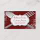 Stylish deep red business card, with graphics of a large silver tone fork and spoon, and elegant white flourishes, in the corners. A decorative white and silver tone text plaque, over the silverware, has custom red text. The back of the card is done in a dark red, with custom white text ready to personalise. Stylish stand out card that leaves a great lasting impression for your catering or any food service business.