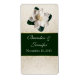 Elegant wedding mini wine labels ready for you to personalise with your own information. Chic ivory coloured damask pattern, on the top and bottom of the label, with a dark green text area, in the centre, edged on either side with a gold tone accent, and a lovely white gardenia flower, at the top of the label. Text, in ivory, is fully customisable to suit your wedding needs. Great for your wedding reception table or gift wines.