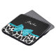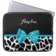 A chic black and white giraffe print 15'' laptop sleeve with a trendy aqua blue ribbon tied into a girly bow. Personalise this cute animal print design by adding your name. Flat printed image, not actual bow.