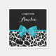 Chic black and white giraffe print paper napkins with a trendy aqua blue ribbon tied into a girly bow. Personalise this cute animal print design by adding the name of the party girl. Flat printed image, NOT actual bow.