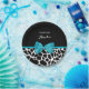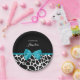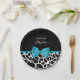 Chic black and white giraffe print paper plates with a trendy aqua blue ribbon tied into a girly bow. Personalise this cute animal print design by adding the name of the party girl. Flat printed image, NOT actual bow.