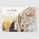 Chic, modern holiday design featuring sleek custom "Joyful" script in gold gradient style with unique curved photo template and subtle gold watercolor style winter landscape.