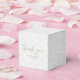 Elegant white on white filigree print pattern with your names in chic gold lettering, these 2" square party favour boxes are beautiful for wedding favours, bridal shower favours or any special occasion.