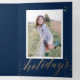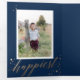 This unique tri-fold holiday design features a dark blue background with faux gold foil stars and typography. The front cover is simply a single vertical photo. As you open the card you see a single square photo with your main holiday text. As you fully open the card you see one photo on the left, one photo on the right, and in the middle are three smaller horizontal photos with personalised text. The greeting on the inside says "Happiest Holidays" in faux gold foil script with more stars. The back of the card is blank but you could easily add another photo or more text. This design is a perfect choice for a chic and elegant message of Christmas joy. The multi-photo layout allows you to upload a total of SEVEN of your favourite family photos in various sizes. The look is modern yet elegant.