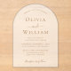 Chic arch-shaped frosted acrylic wedding invitation featuring the names of the bride and groom in elegant gold serif typography and the wedding details in simple, modern gold lettering.
