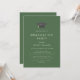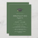 This chic green grad cap graduation party invitation is perfect for a modern outdoor party. The simple design features classic dark forest hunter green and white typography with a black and gold watercolor graduation hat.