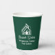 This professional realtor paper cup is custom made with your real estate company name under the modern cursive script for an open house. This chic custom green realty business party decor features a house logo image for home builder or realty agent company marketing.
