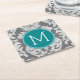 Chic Grey and Teal Damask Pattern Custom Monogram Square Paper Coaster
