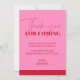 🎉 Show your gratitude in style with the Pink and Red Chic Elegant Birthday thank‑you card. The front features a sleek pink background that fades into a luxurious red base, creating a sophisticated contrast that instantly catches the eye. At the top, a bold red script reads “thank you for coming,” followed by a heartfelt thank‑you message and “love + [name]” in matching red lettering. The reverse side continues the elegance with a smooth red backdrop, providing ample space for a personal note. This Pink and Red Chic Elegant Birthday thank‑you card is perfect for birthdays of all ages, offering a timeless, chic and elegant way to express appreciation. ✨🥂