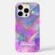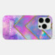 Chic holographic girly elegant blue pink iPhone 16 Case. This design creates a futuristic aesthetic with its layered, holographic geometric shapes. The abstract pattern reflects hues of blue, pink, and violet, catching the light in dynamic ways to give the iPhone case a three-dimensional, high-tech look.
