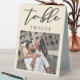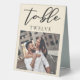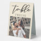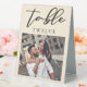 This simple elegant ivory wedding table number table tent sign features chic black typography above an engagement photo. Add your favourite romantic couple photographs for your tables.