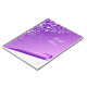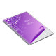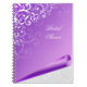 Elegant wire bound notebook done in a pretty lavender, with graphics of a curled up bottom corner, showing a white on white damask pattern underneath. Lovely graphics of a white fancy flourish, decorates the upper left side of the notebook. White script text is ready to personalise to read anything you want. Great for bridal showers, weddings, personal, school, or business.