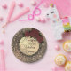 A glittery leopard print on a dusty rose pink backdrop with a gold circle in the middle where you can customise it which is adorned with an elegant gold flourish joined by three roses for added elegance. Chic glam vibes.