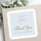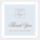 Chic, light dusty blue and white business thank you sticker with your logo and the text “thank you" printed in a romantic calligraphy script font with a white border along the edge. You can change the font, font color, border color and background color with the design tool.