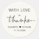 Chic light cream thank you sticker for your wedding reception favours and thank you cards featuring "With Love + Thanks" in simple modern typography and a stylish script, your names joined together by a heart and your wedding date.