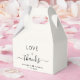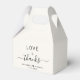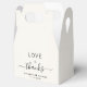 Chic light cream wedding favour box featuring "love + thanks" in simple modern typography and an elegant calligraphy script with swashes, your first names joined together by a heart and your wedding date.