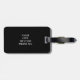 CHIC LUGGAGE TAG_MOD 01 RED AND BLACK FLORAL POPPIES ON BLACK AND WHITE STRIPES. WHITE CENTER WITH AND BLACK MONOGRAM. BLACK BACK WITH WHITE INFORMATION TEXT.