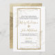 A classic traditional white background and gold handwritten script calligraphy ampersand with luxury gold glitter foliage floral wedding invitations.