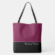 This lovely fashion forward tote bag shows the word "Maid of Honour" in white text colour over black with the upper tote bag in custom Cassis. Has plenty of room for personalised text. Graphics and text are on both sides of this tote bag. Black handle. Customise further or buy as shown.