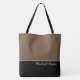 This lovely fashion forward tote bag shows the word "Maid of Honour" in white text colour over black with the upper tote bag in custom Latte Brown. Has plenty of room for personalised text. Graphics and text are on both sides of this tote bag. Black handle. Customise further or buy as shown.