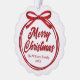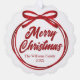 Chic, modern cursive script across a gorgeous red ribbon and bow reads MERRY CHRISTMAS in elegant cursive typography. A tied bow is super trendy for 2025 holiday party ornament cards. Personalize with your family or business name in the center.