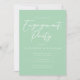 This soft mint green engagement party invitation features chic white script for a sweet spring outdoor event. Simple typography on a tranquil solid pastel green invite for a garden venue.