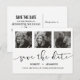 Bold Minimal Modern BLACK SAVE THE DATE postcard featuring a black Modern script on the front , 3 engagement photos and a template postcard on the back.