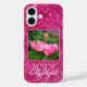 Give mum, grandma, girl friend, or special friend a beautiful custom pink girly glitter phone case with a cherished photo that she carry wherever the phone goes.The case now features a place holder photo of a green anole lizard perched on the petal of a beautiful pink tropical Hibiscus flower surrounded by greenery. Pink and green are prominent colours in nature. Replace the placeholder photo with her favourite photograph like one from Instagram or if you like the floral placeholder photograph keep it. Choices rock. Fill in the template name and initial, remove the text or use the edit design tool to select a font style, size, and colour you prefer.
