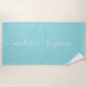 Chic monogrammed beach towel with the names of the newly weds in handwritten white elegant script calligraphy on a turquoise blue background. Simply add your names. Perfect gift for the newlywed couple or engaged couple. Exclusively designed for you by Happy Dolphin Studio. If you need any help or matching products, please contact us a happydolphinstudio@outlook.com.