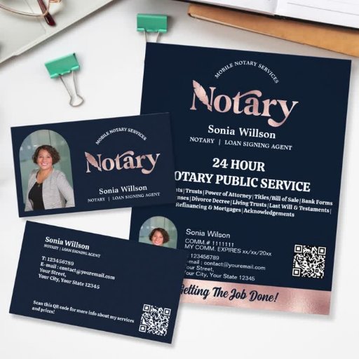 Chic Rose Gold Notary Public Loan Signing Agent Business Card with your photo and QR code