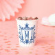 These chic pagoda monogram cups are perfect to use for entertaining and make an excellent hostess gift. The pagoda design and the monogram are in a navy blue on white.