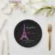 Glam Paris themed Sweet Sixteen birthday party paper plates, done in black, with graphics of a pink glitter looking Eiffel Tower and white twinkling stars. Personalise the custom white and pink text to read what you want. Matching napkins and invitations are available.