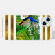 “Born to sparkle.” There’s nothing quite as stunning as a royal blue peacock with its green gem-hued feathers. Celebrate its beauty every day every time you use this sparkly custom cell phone case of this chic bird photo against a background of simulated gold foil and white stripes. A great gift, especially for yourself!