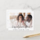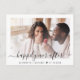 Modern save the date announcement postcard featuring your photo overlayed with "happily ever after" in a chic script with swashes and your names and wedding date joined together with a heart. On the reverse side, customise your save the date message in elegant typography and input your wedding website address to create a QR code for your guests to scan for wedding updates and details.