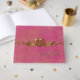 Elegant wedding \ special occasion guest book done in a pink with gold dot pattern. Graphics of gold metallic looking jewel band runs across the middle of the book and is decorated with gold and dark pink jewel like hearts. Gold graphic text, on the front, reads Guest Book. Customise this lovely guest book to add your own text or leave as is.