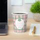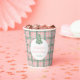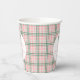 This understated paper cup design features a pink and green tartan pink background with a chinoiserie inspired Christmas tree illustration.