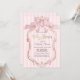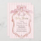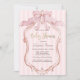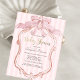 Watercolor pink bow, and retro frame on pink striped background. Ideal for a chic, feminine baby shower brunch celebration, this design blends a sweet coquette style with soft, inviting colors.
