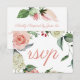 Request a wedding RSVP from your family and friends to be with you when you recite your marriage vows by sending them this beautiful chic pink floral RSVP wedding enclosure card. This design features a lovely watercolor floral circular bouquet that surrounds the pretty script text. The beautiful and elegant colours of blush pink, peach, and soft grey with green botanical touches coincide perfectly. Personalise all of your details and customise the fonts and colours as you like on the back Of the card for a chic and elegant look. Mix and match with other wedding accessories in this exquisite wedding collection.
